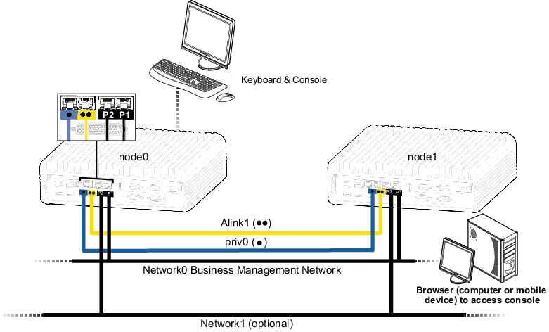- The yellow cable for A-Link1 from yellow embedded port (•• or A1 on some systems) on node0 to the same embedded port on node1.