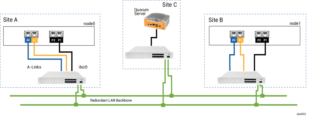 A well-planned ALSR configuration consists of the two nodes at two different locations, and a third computer that runs the quorum service at a third location. All of these computers are networked together with appropriate network switching equipment, so that no single point of failure exists within the ALSR configuration. The following figure illustrates such a configuration, which includes node0 at Site A, node1 at Site B, and the quorum server at Site C.